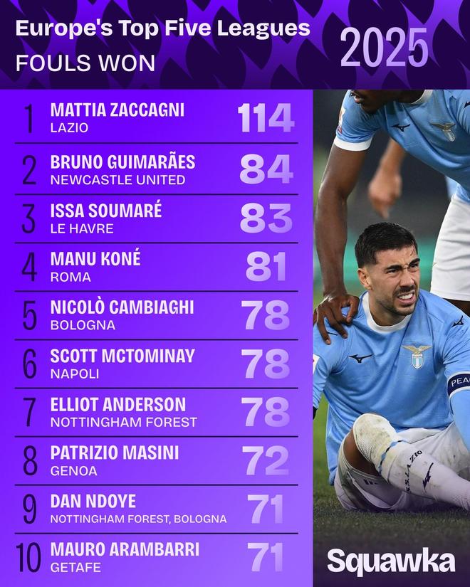 12月31日,据知名数据网站Squawka统计,2025年欧洲五大联赛的被犯规次数榜出炉。拉齐奥前锋扎卡尼以114次高居榜首,纽卡中场吉马良斯84次位列次席。